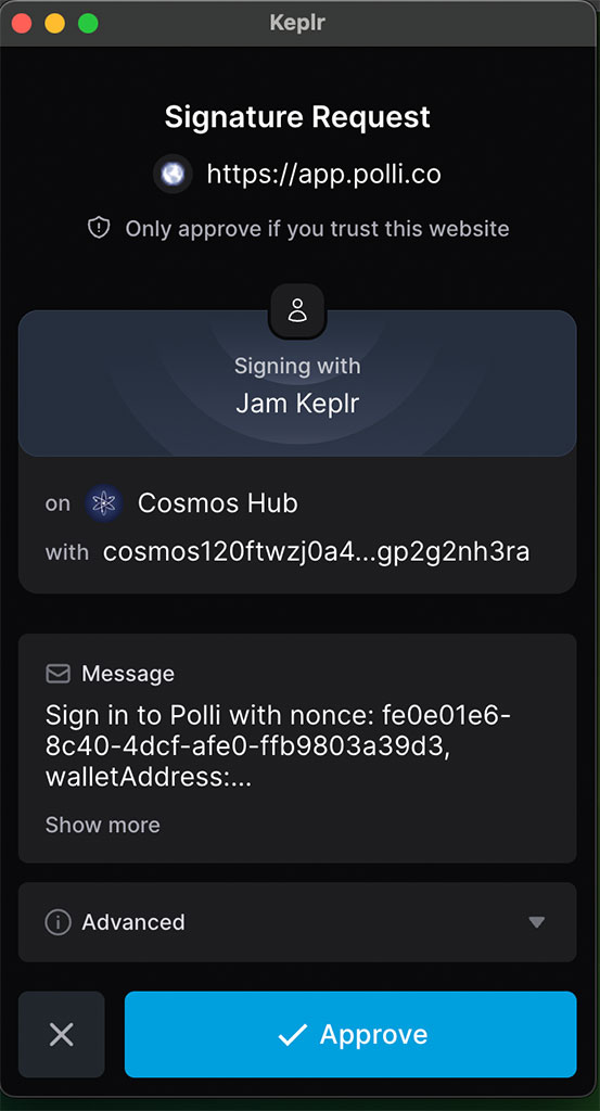 Connect your wallet and approve the connection through your wallet interface. Polli never takes custody of your assets; it only receives permission to interact with your wallet for staking operations.